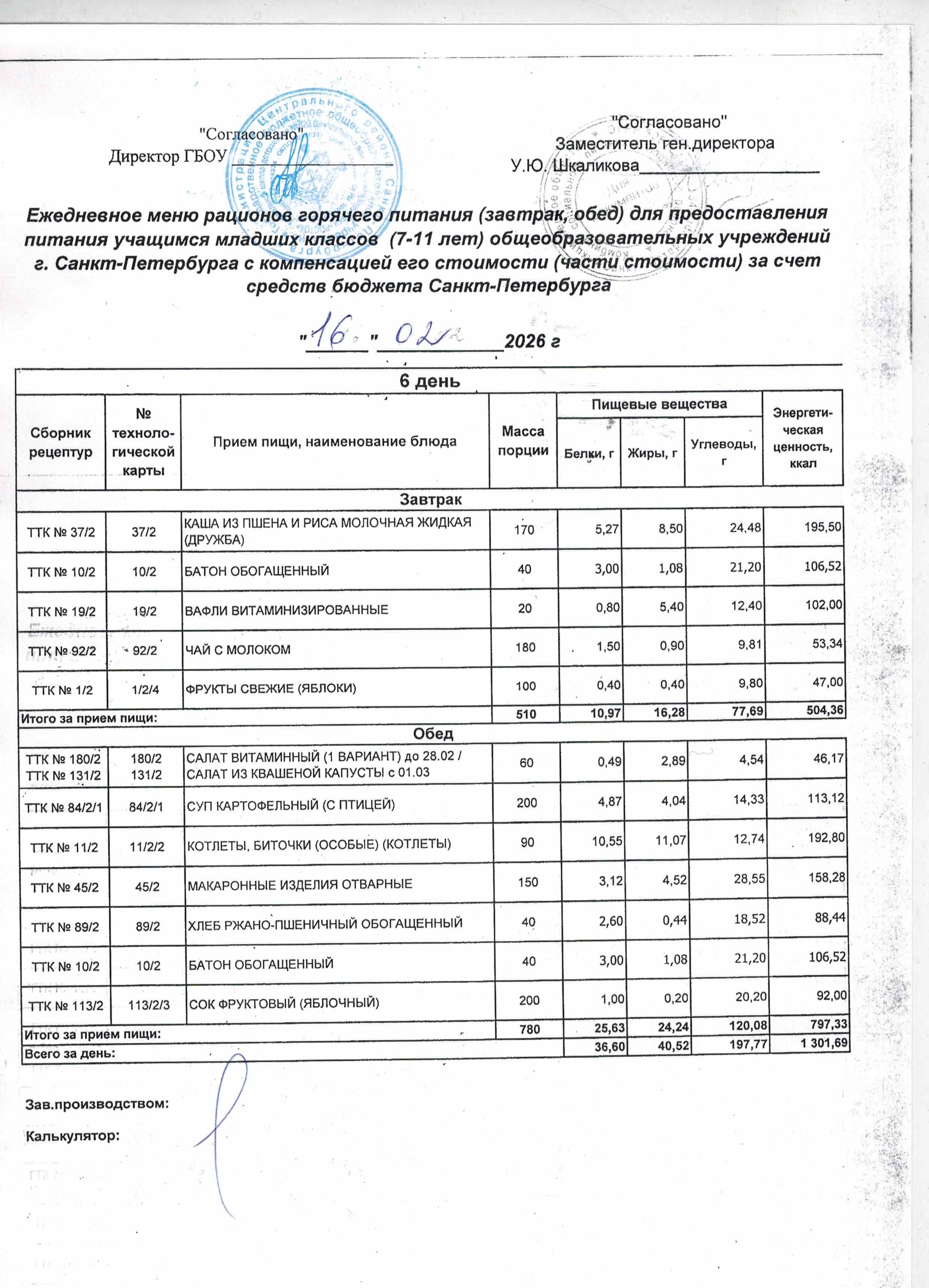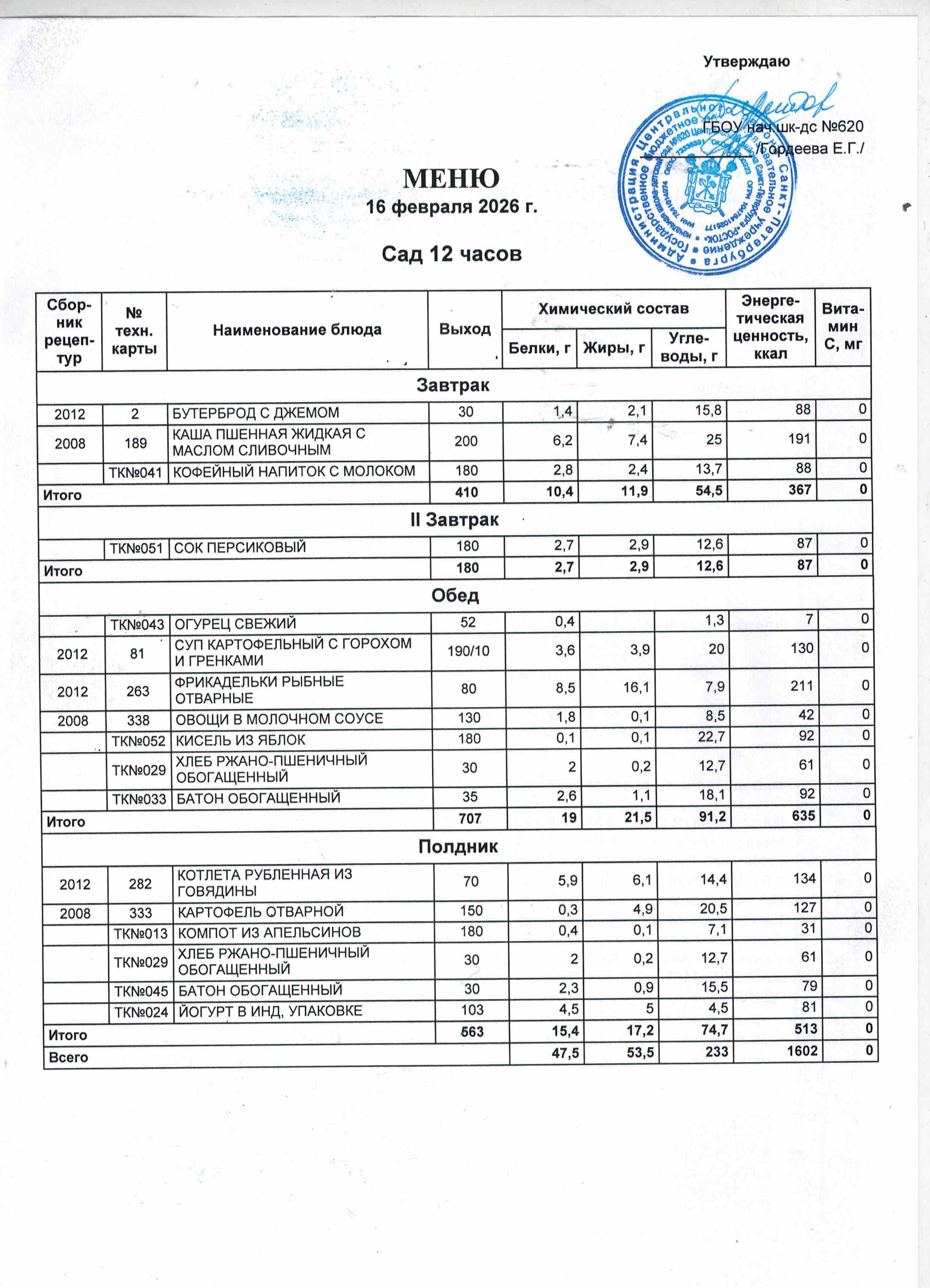 Ежедневное меню на: